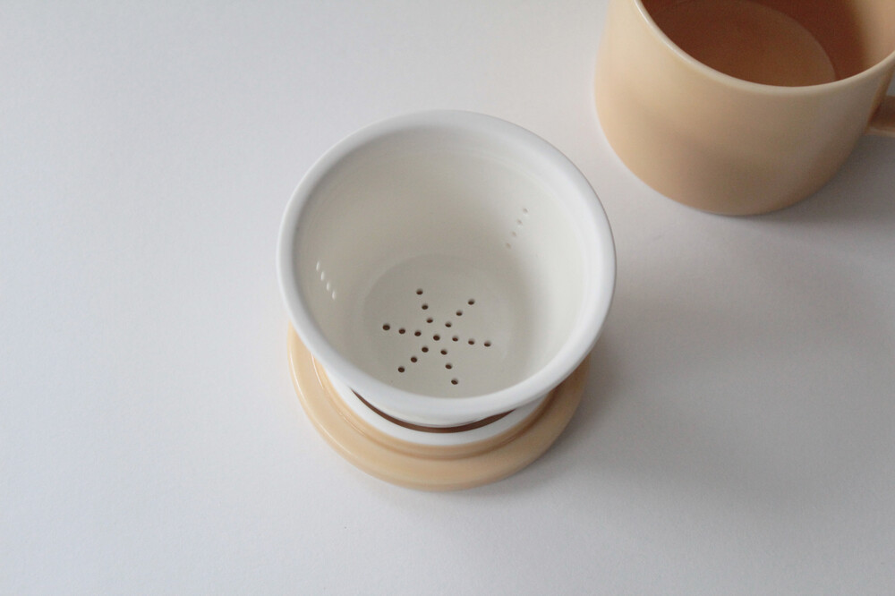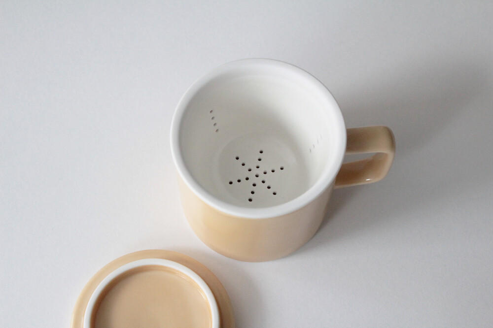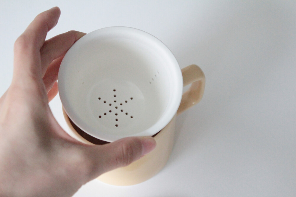 티 머그의 뚜껑을 열고 뒤집어서 내려 놓은 뒤, 스트레이너에 잎차를 넣어 차를 우려내고