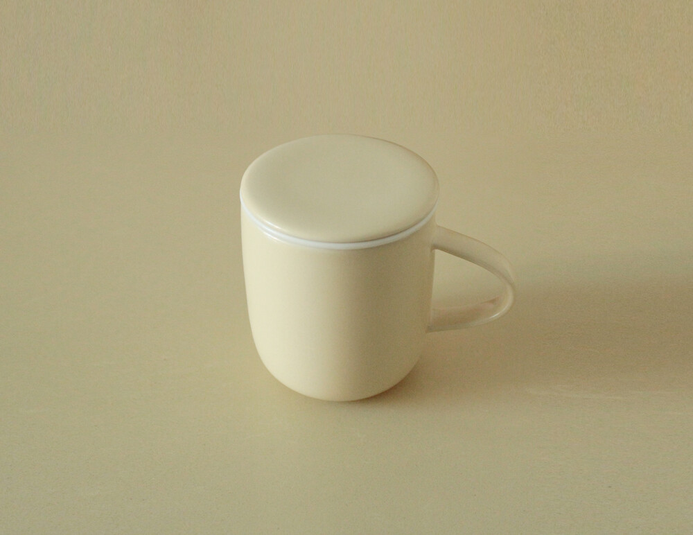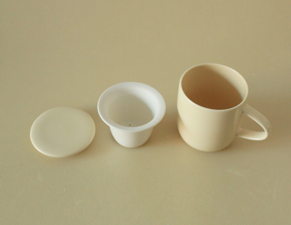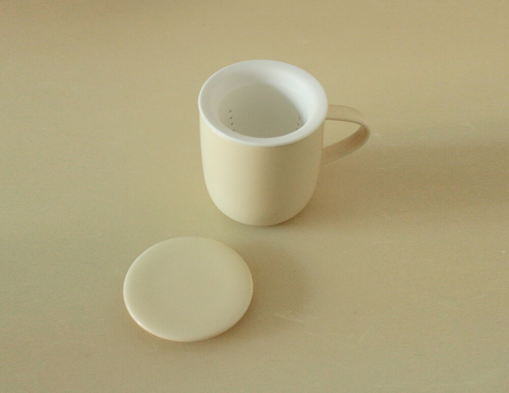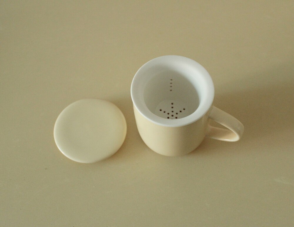 티 머그의 뚜껑을 열고 뒤집어서 내려 놓은 뒤, 스트레이너에 잎차를 넣어 차를 우려내고