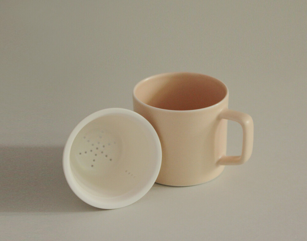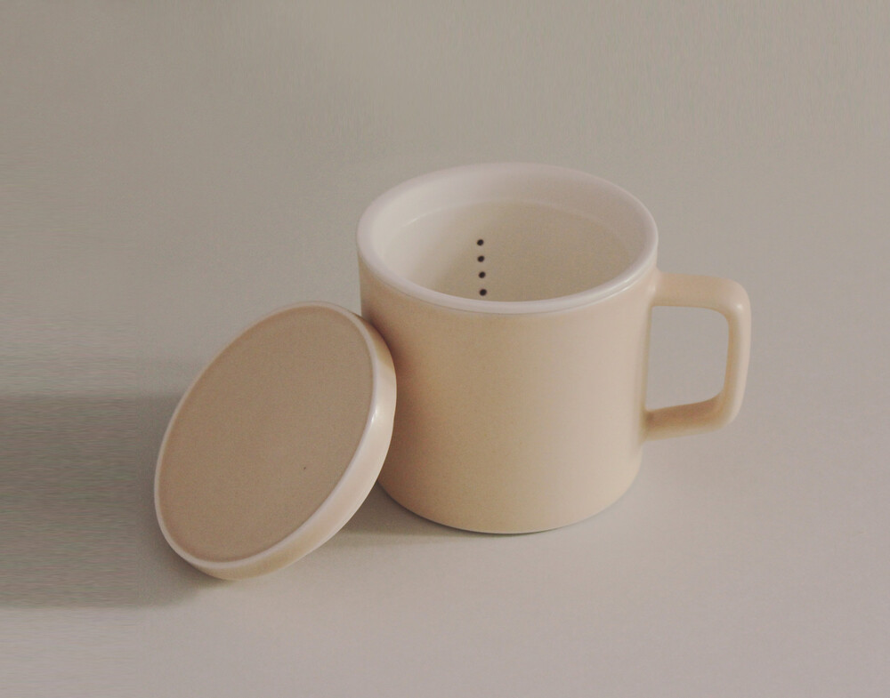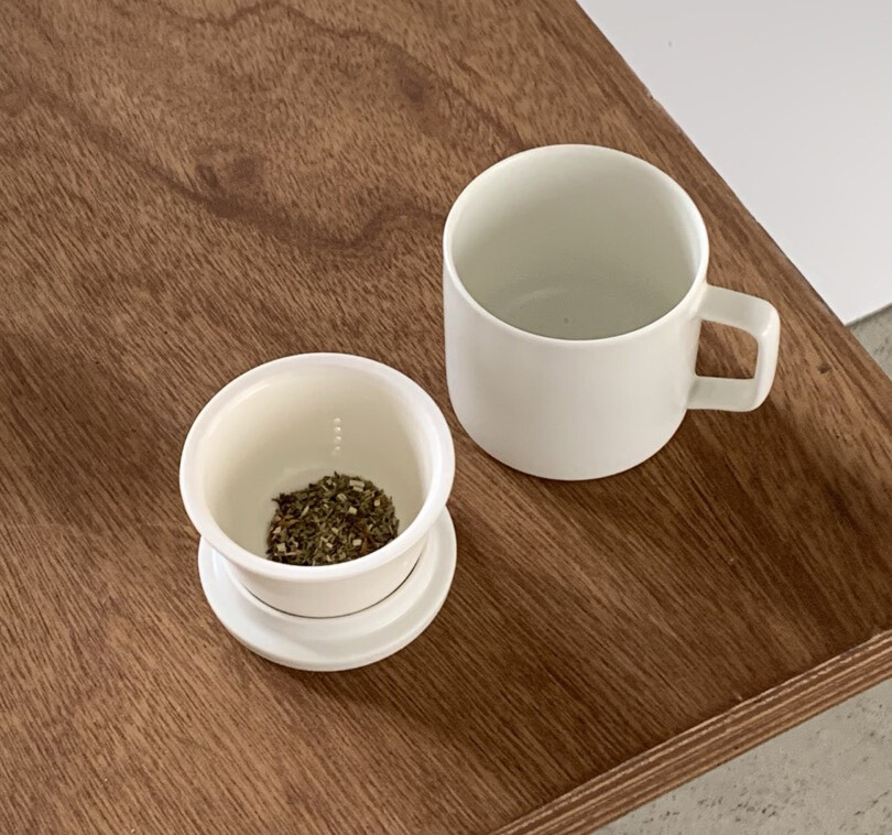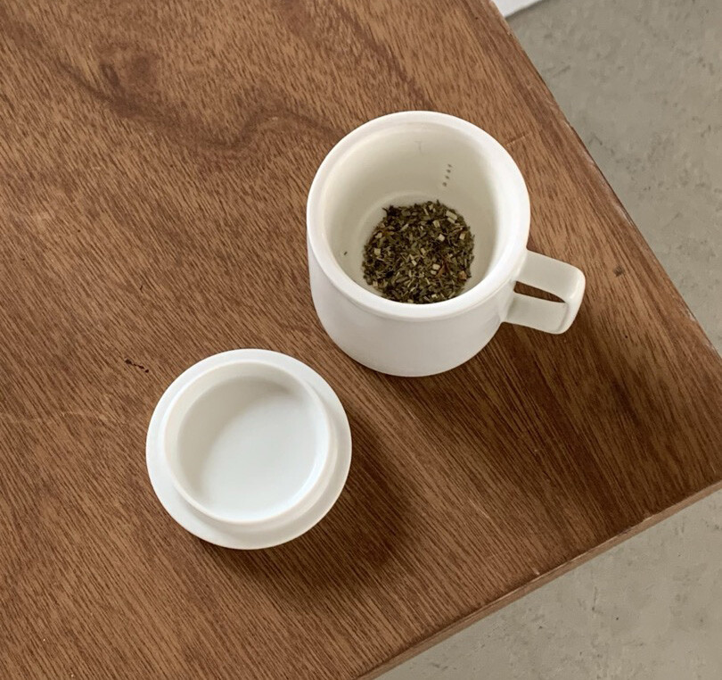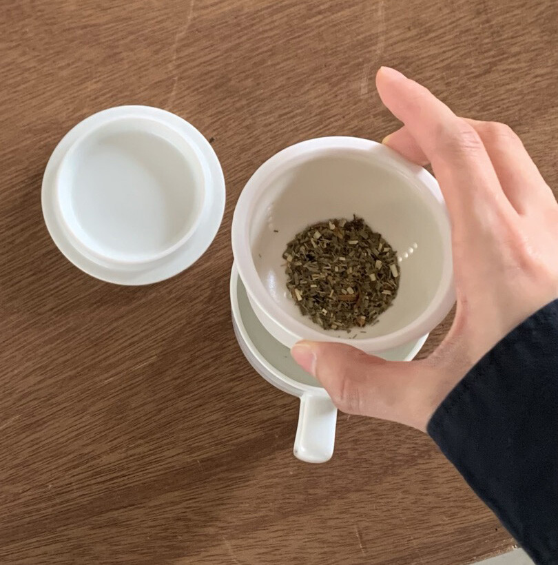 티 머그의 뚜껑을 열고 뒤집어서 내려 놓은 뒤, 스트레이너에 잎차를 넣어 차를 우려내고